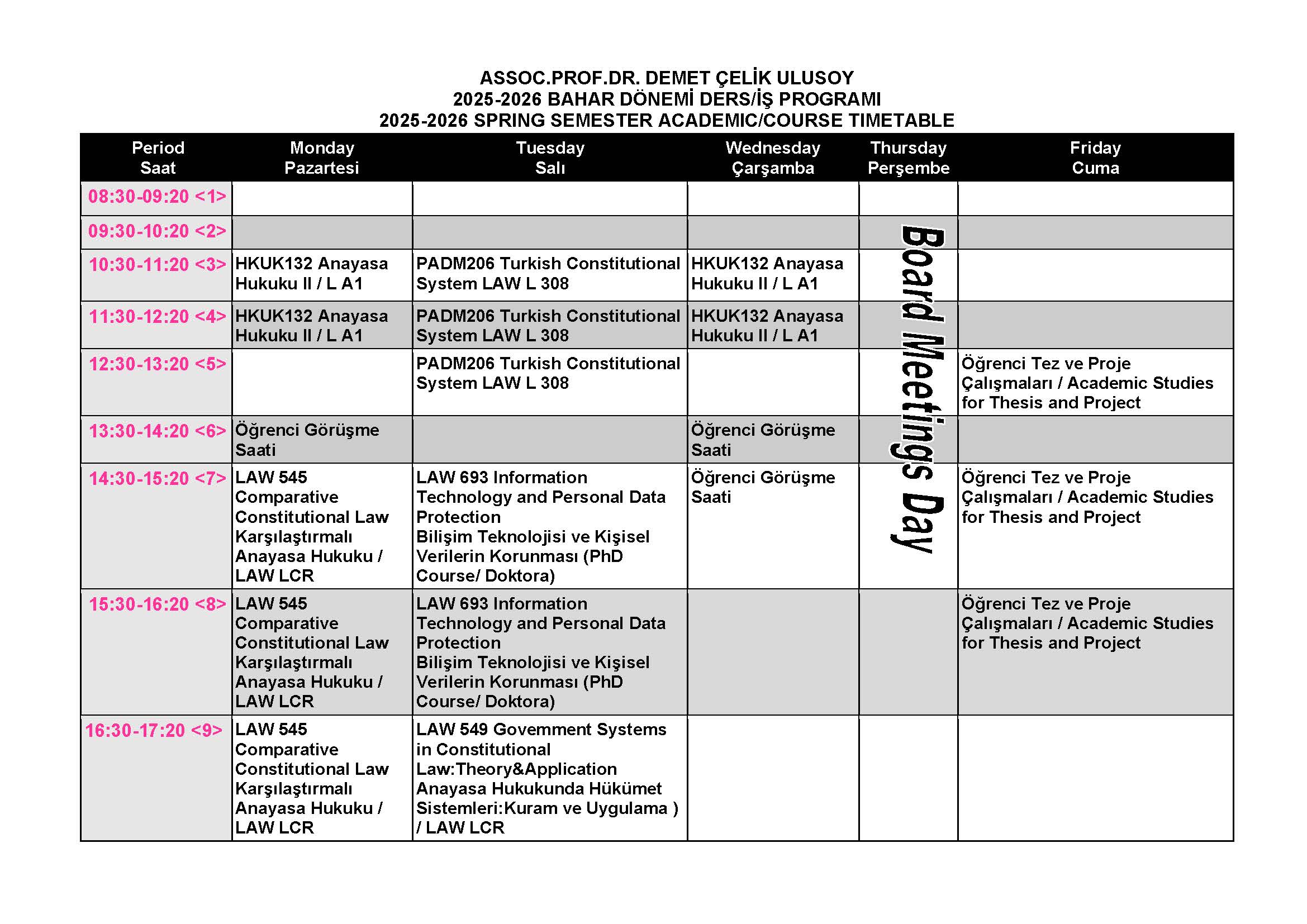 DOÇ. DR. DEMET ÇELİK ULUSOY DERSLER BAZINDA AKADEMİK TAKVİM (Academic/Courses Calendar)